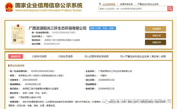 2018年8月23日,廣西資源陽光三環生態環境有限公司在工商局注冊登記完成。此公司為深圳市陽光三環生態環境股份有限公司(股票代碼:870901)全資子公司。