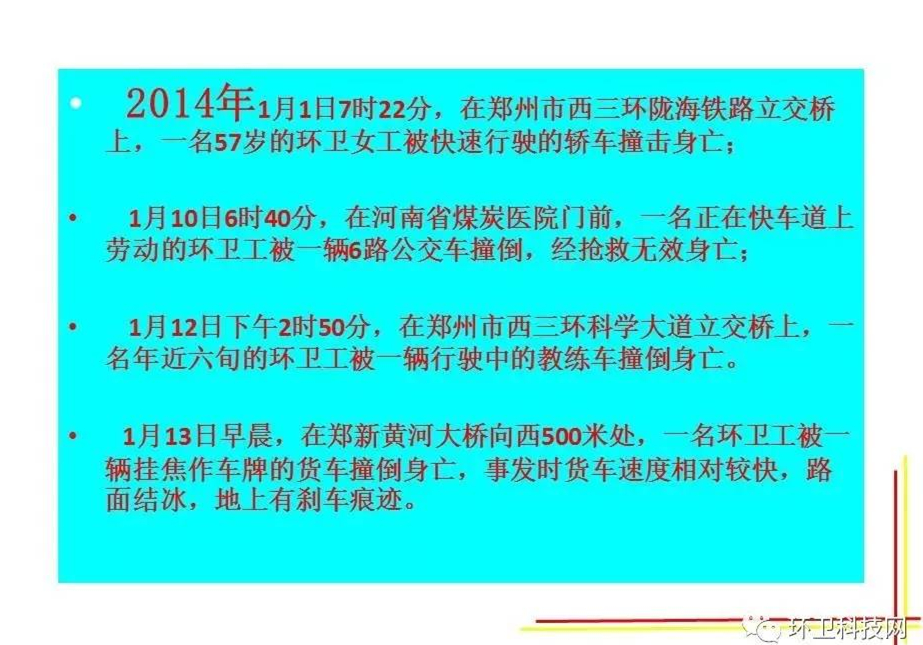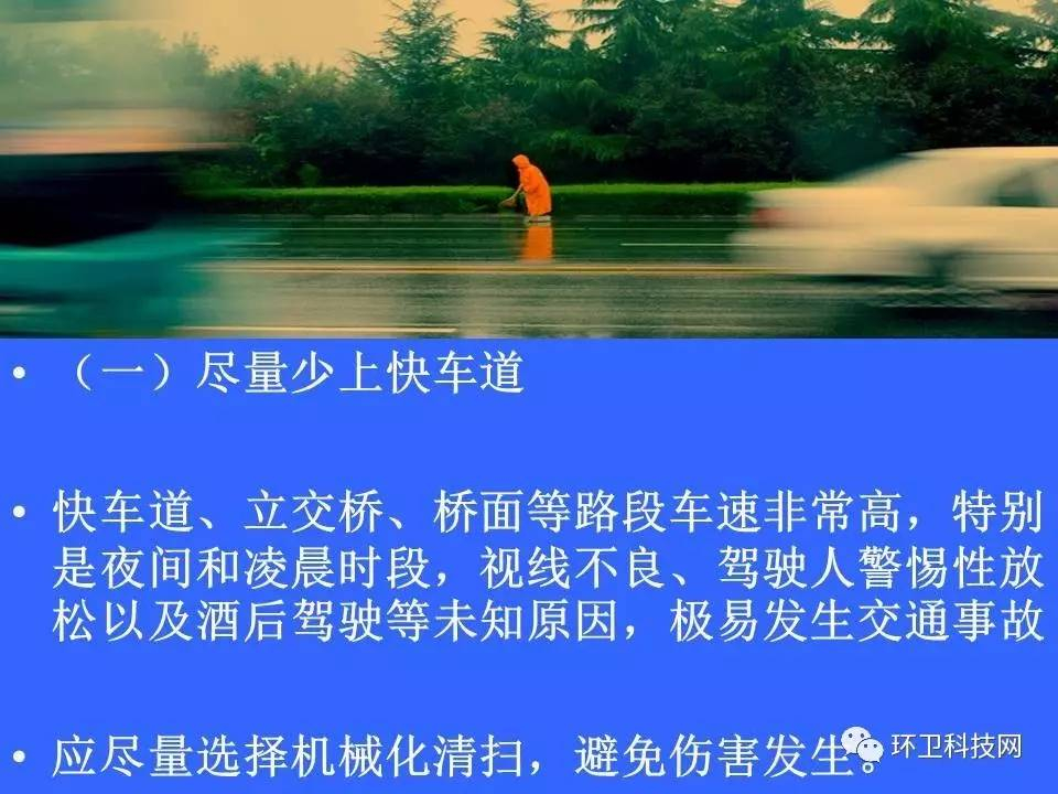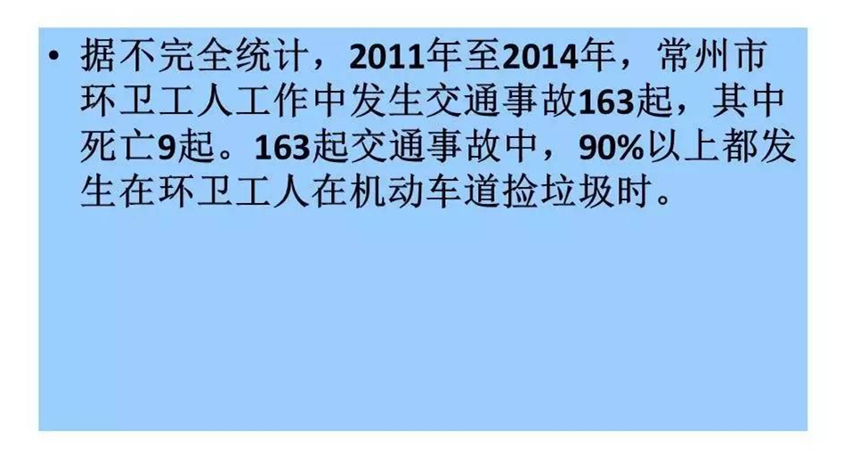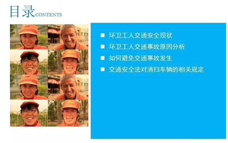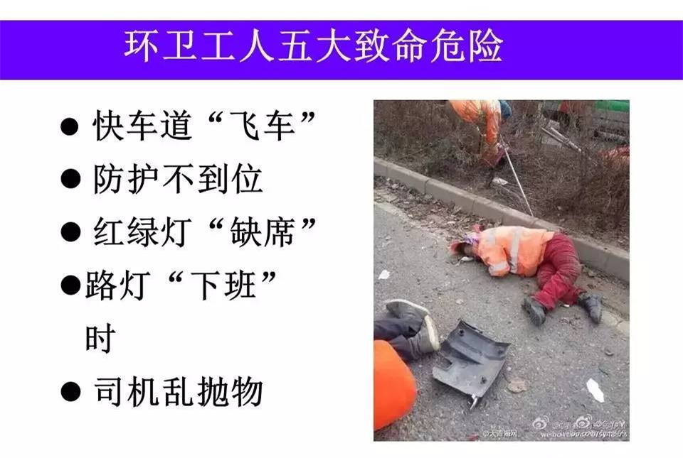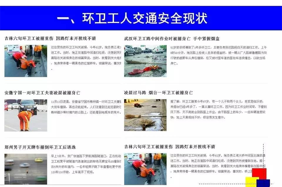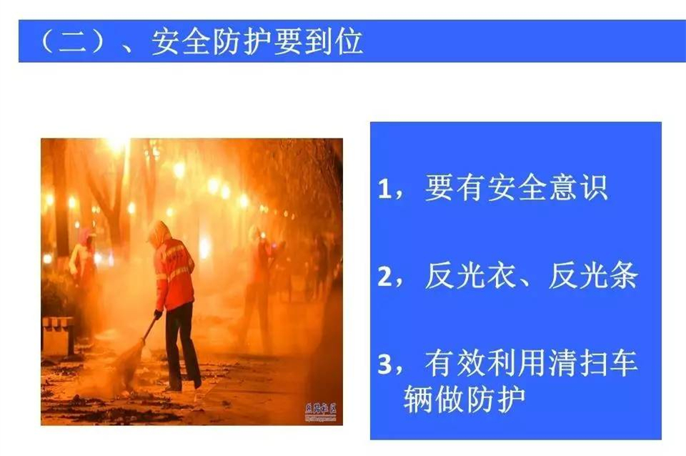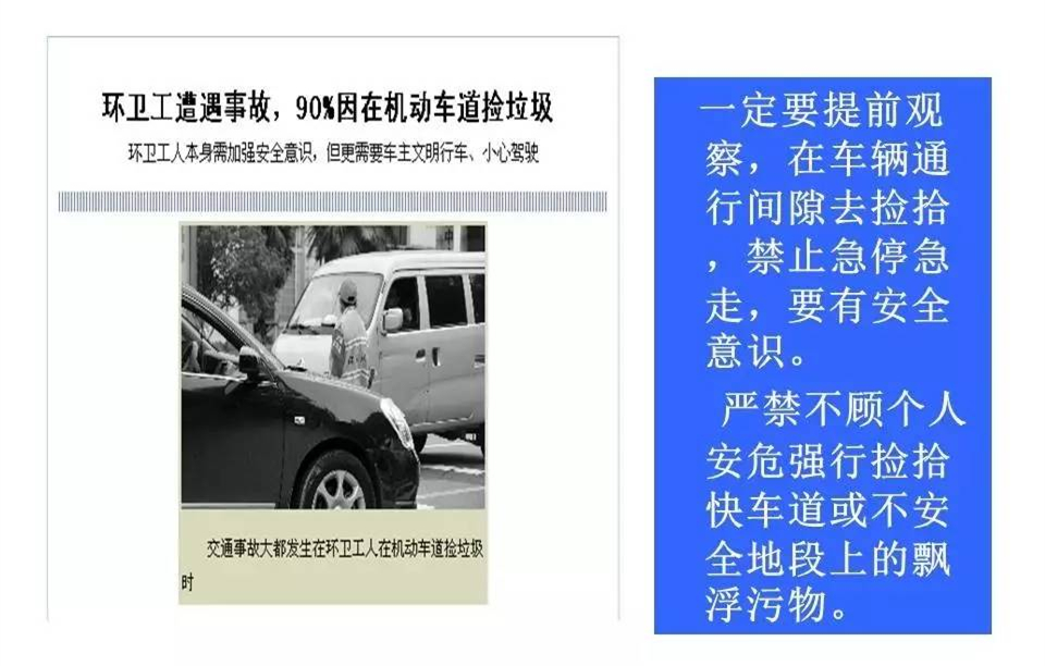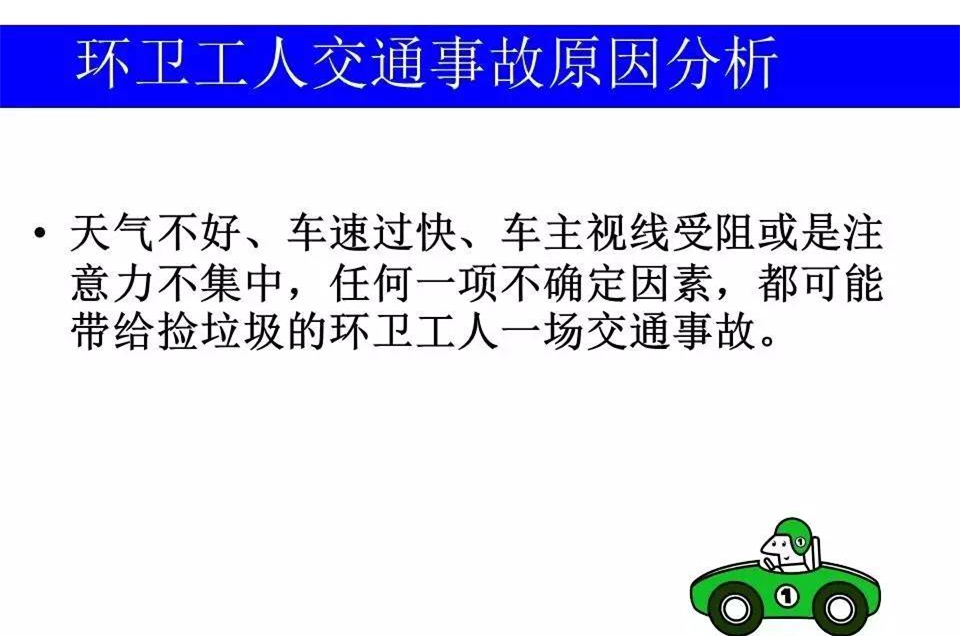 道路就是環(huán)衛(wèi)工人的工作崗位,交通事故每天每時每刻都在威脅著他們的人身安全。今天我們共享一個環(huán)衛(wèi)工人交通安全講座的PPT,一要提高環(huán)衛(wèi)工人的安全防范意識,二要讓每一位市民,都遵守交通規(guī)則,不車窗拋物。一定可以大大減少無謂的犧牲。
