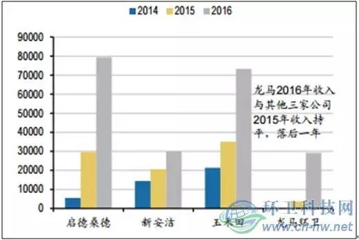2015年龍馬環衛服務收入僅3633萬元,其他三家公司2014年平均收入1.38億,兩者相差接近1億。再向后各推移一年,2016龍馬該板塊營業收入2.92億,而其他三家公司2015年的平均收入為2.84億。可以看出,目前龍馬收入落后其他公司約1年之久。考慮到玉禾田是以傳統物業保潔業務起家,創立時間均超過10年,從業經驗豐富、客戶資源充足,具備先發優勢。而龍馬則是2015年開始提出“設備+服務”雙輪驅動戰略,起步稍晚,但憑借設備領域的優勢,迅速縮短了與傳統優勢企業的差距。