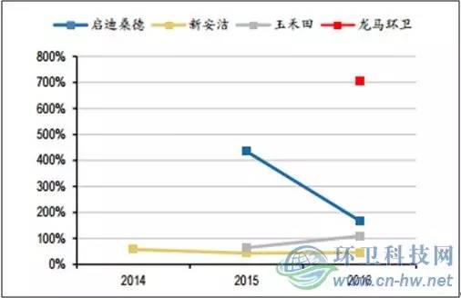 從收入增速來看,啟迪桑德和龍馬環衛的增速明顯更高,這一方面是由于這些企業剛剛切入環衛市場,前一年基數較小導致;另一方面也反應了龍馬和桑德作為各自行業的領先企業,其借助主業建立的客戶網絡和資本優勢,迅速擴大自己在環衛市場的份額,資本優勢再次顯現。其中,桑德2015年增速435%,2016年則超過150%,而龍馬2016年增速超過700%,對比啟迪桑德,按照滯后一年的思路,我們認為龍馬今年環衛服務增速依然可以保持在100%以上的水平,從而進一步拉近與其他企業的距離。相比之下,傳統的環衛公司業務發展也保持較高增速,新安潔的收入增速保持在50%左右。另外,作為另一家傳統環衛公司,玉禾田去年收入大幅增長109%,主要是新增了海口秀英區PPP項目收入,借助大型環衛項目大幅擴張。