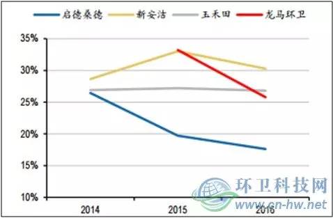 從毛利率來看,龍馬2016年毛利率為25.77%,相比15年下降7.46個百分點,而啟迪桑德的2016年毛利率17.61%,相比2015年前也下降了2.11個百分點,這主要由于中標環衛產業服務項目增加,而新增項目多處于磨合期,導致總體成本上升。相比之下,傳統環衛公司從業經驗豐富,具備更強的成本控制能力,毛利率基本穩定在27%-30%,波動范圍稍窄。