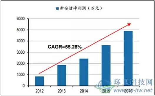隨著政府對公共事業投入的持續增加,新安潔的盈利總額也在迅速擴大。2016年公司凈利潤4912萬元,近5年復合增長率55.28%。行業發展的迅猛,帶來企業登陸資本市場所需的利潤累積。