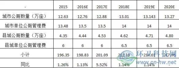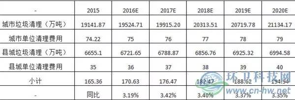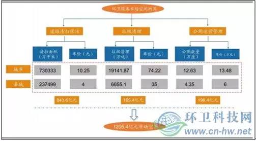 目前,我國一、二線平均清掃價格在10-12元/平方/年左右,垃圾清運價格在70-80元/噸,而公廁的年運營費用在12萬/座左右。我們以全國代表性項目海口市龍華區環衛一體化PPP項目的單價為標準,其一級道路清掃保潔單價為10.25元/平米·年、垃圾清理74.22元/噸·年,公廁運營管理13.48萬元/座·年,而縣城價格不到城市維護單價的一半,縣城的上述三項單價我們分別取5元/平米·年、35元/噸·年、6萬元/座·年。根據《2015年中國城鄉建設統計年鑒》披露的中國城鄉清掃面積、垃圾清理及公廁數量,可以計算出2015年我國環衛市場空間大致為1205億元。