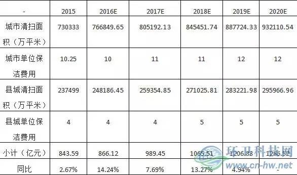 根據《中國城鄉建設統計年鑒》披露的數據,2010-2015年城市道路保潔面積CAGR=8.53%,縣城城市道路保潔面積CAGR=7.23%,考慮到中國經濟發展已經達到一定程度,未來幾年城市、縣城保潔面積增速分別取5%、4.5%;過去十年,中國城市垃圾清理基本保持平穩,CAGR為2.08%,而縣城的垃圾清理CAGR=1.05%,因此我們認為未來中國垃圾清理量也會呈現略微增長走勢,每年增幅分別取2%、1%;同樣,根據過去十年城市、縣城公廁的復合增長率為0.95%、2.26%,未來5年這兩個數值我們分別取1%、2%。同時,由于環衛合同簽訂年限較長,在已經簽訂的合同期限內單位費用不會變化,另外考慮到每年新簽合同的影響,總體的單位服務費用也會呈現小幅上漲的趨勢。遵從上述邏輯,根據我們的測算,到2020年中國環衛服務總體市場規模將接近1700億元,復合增長率達6.8%,其中道路清掃保潔服務規模1266億元,居于首位,垃圾清理和公廁運營也將在200億以左右。