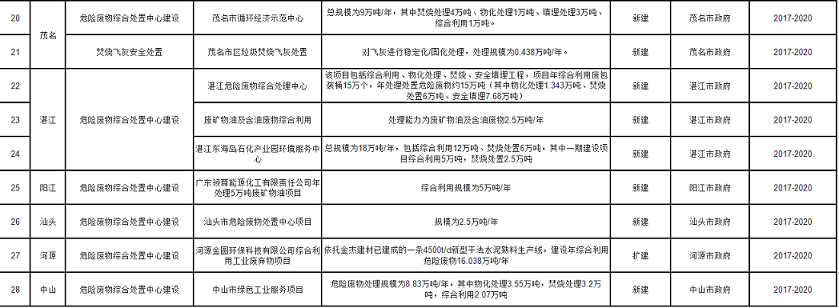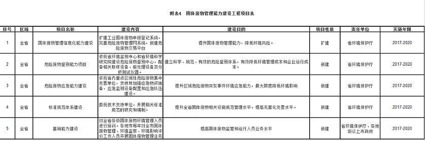 (二十八)實(shí)施重點(diǎn)工程。為落實(shí)行動(dòng)計(jì)劃目標(biāo)任務(wù),實(shí)施一批重點(diǎn)工程,充分發(fā)揮骨干企業(yè)在固體廢物處置利用行業(yè)的主力作用和標(biāo)桿作用,加快解決當(dāng)前固體廢物污染防治存在的突出問題。重點(diǎn)工程包括危險(xiǎn)廢物安全處理處置、醫(yī)療廢物安全處理處置、工業(yè)固體廢物綜合利用、固體廢物管理能力建設(shè)等4大類工程,具體項(xiàng)目見附表。污泥無害化處理處置及生活垃圾無害化處理處置具體工程按照《廣東省城鄉(xiāng)生活污水處理設(shè)施建設(shè)“十三五”規(guī)劃》和《廣東省城鄉(xiāng)生活垃圾處理“十三五”規(guī)劃》執(zhí)行。